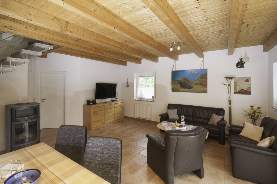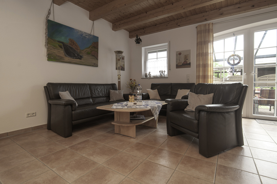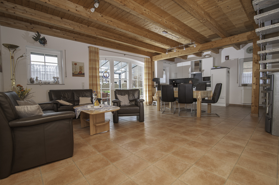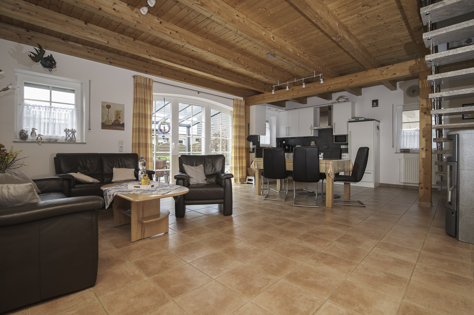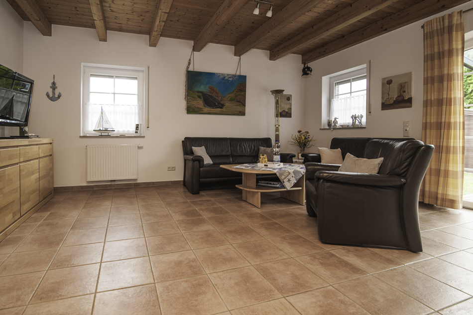 Das Haus hat eine große, offene Küche, einen Esstisch mit 6 Stühlen und einen geräumigen Wohnbereich mit gemütlicher Sitzgarnitur mit SAT-TV. Der Fussboden des Wohn-/Esszimmers ist gefliest.