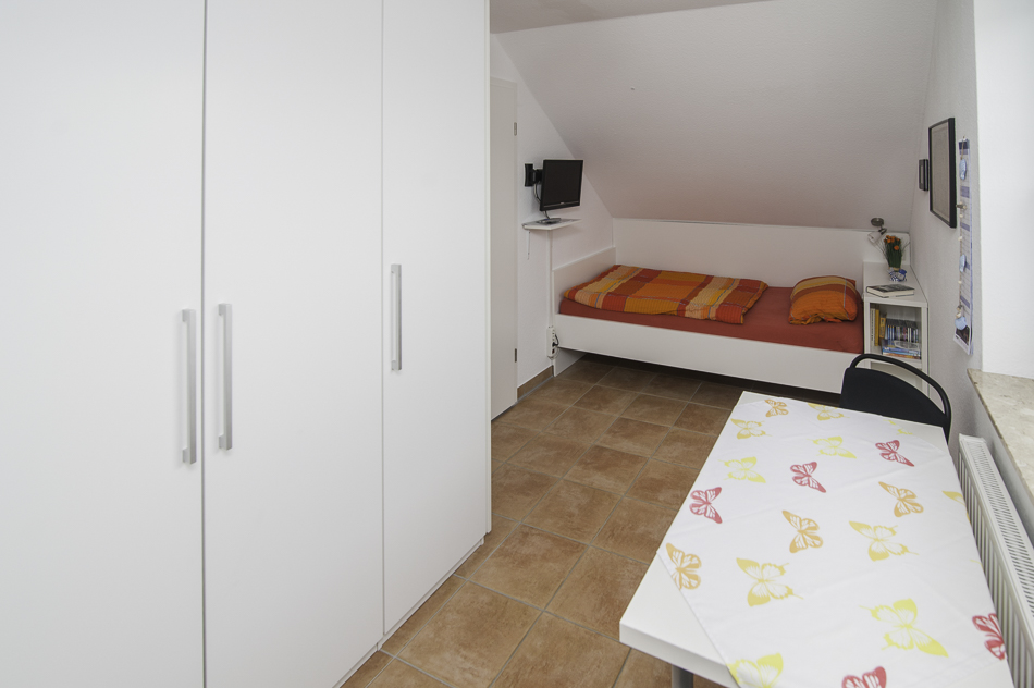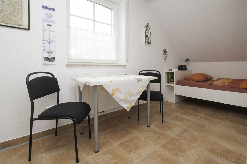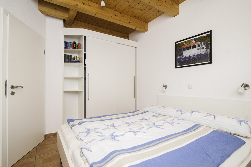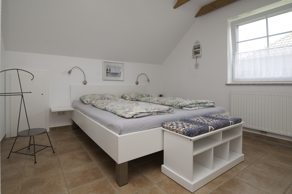 Dazu kommen zwei Schlafzimmer im OG, das eine mit einem Doppelbett (1,80 m breit), Kleiderschrank, SAT-TV, das andere Schlafzimmer mit zwei Einzelbetten (je 1,00 m breit) Kleiderschrank, SAT-TV.