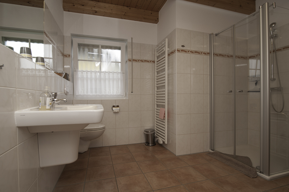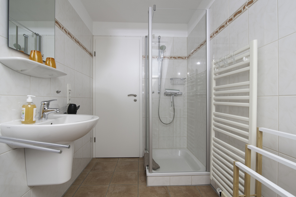 Im Obergeschoss gibt es ein weiteres Badezimmer mit Dusche, Handtuch-Heizung und Fön.
