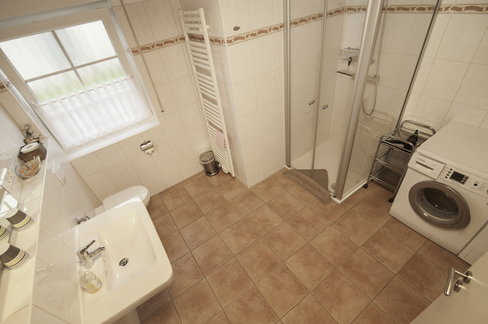 Außerdem befinden sich im Erdgeschoss ein Schlafzimmer mit Doppelbett (1,40 m breit) und Einbau-Kleiderschrank, ein Badzimmer mit großer 90x90 cm Dusche, Waschtisch, Hänge-WC, Waschmaschine und Trockner, Handtuch-Heizung sowie Fön.