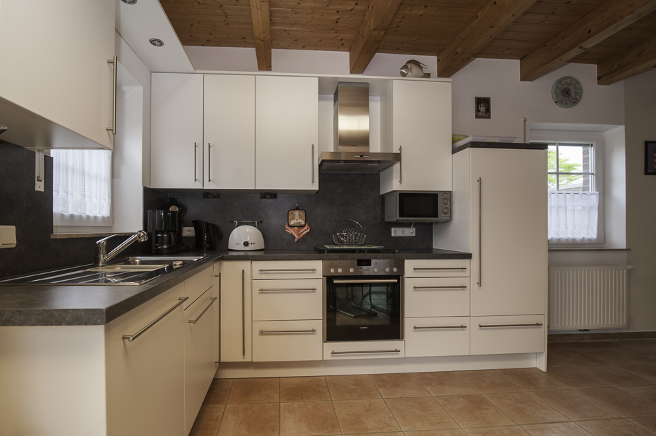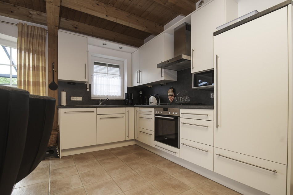 Zur Küche gehört ein Einbauherd, Ceranfeld und Backofen, Geschirrspülmaschine, Kühlschrank mit Gefrierfach. Kaffeemaschine, Mikrowelle, Toaster und mehr.