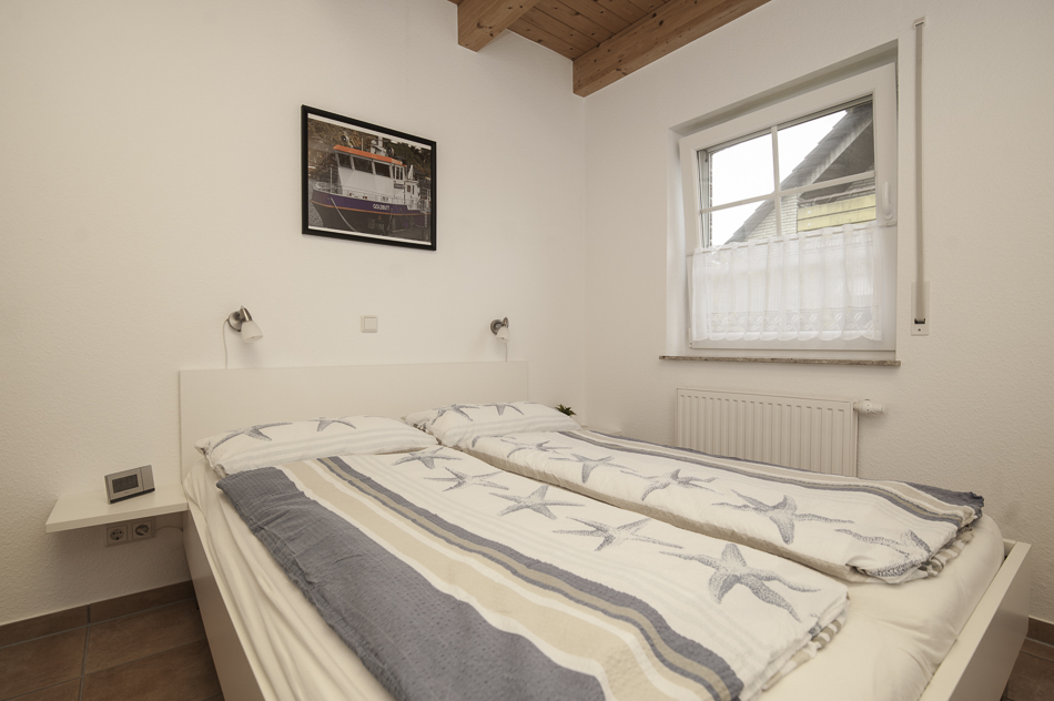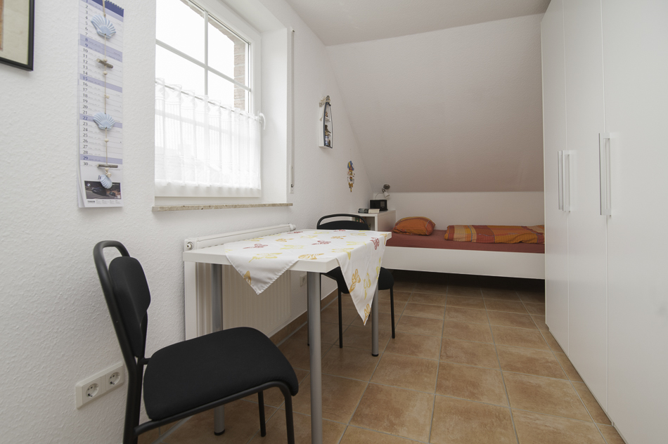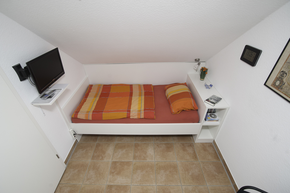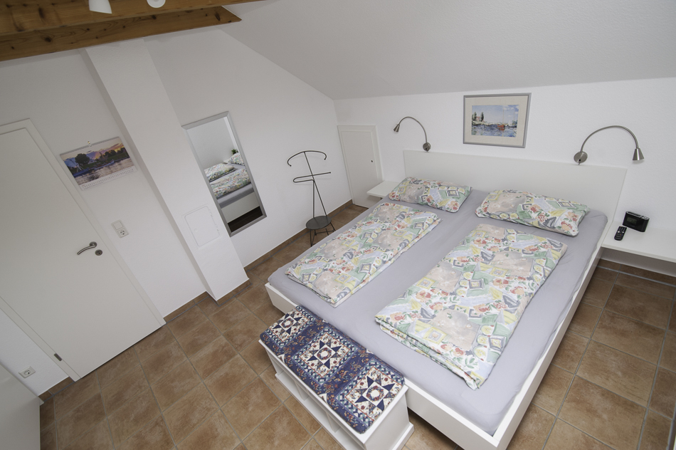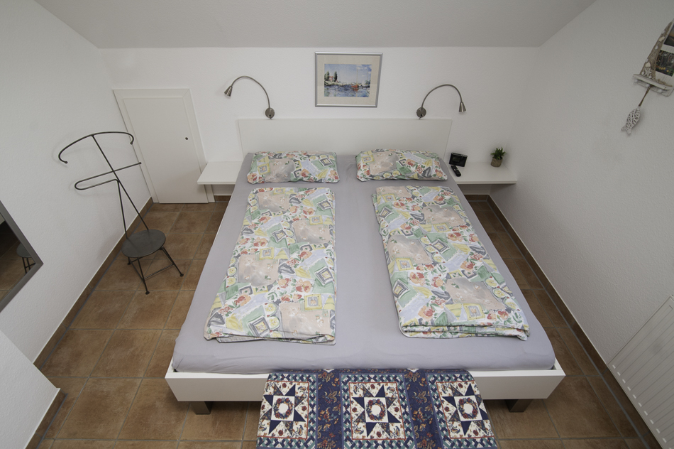 Dazu kommen zwei Schlafzimmer im OG, das eine mit einem Doppelbett (1,80 m breit), Kleiderschrank, SAT-TV, das andere Schlafzimmer mit zwei Einzelbetten (je 1,00 m breit) Kleiderschrank, SAT-TV.