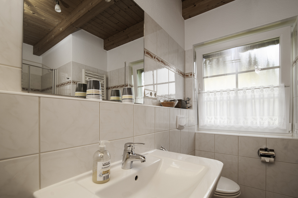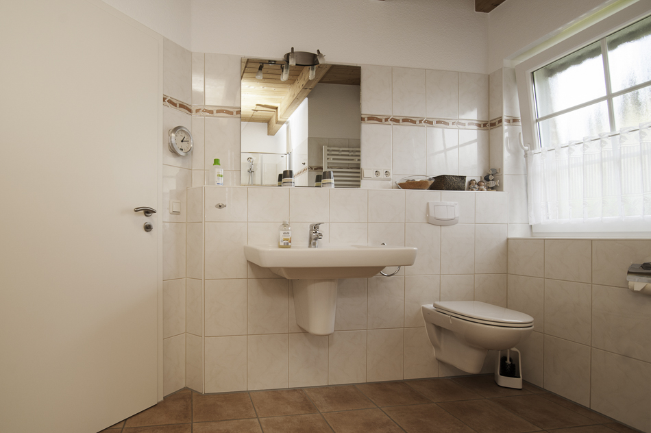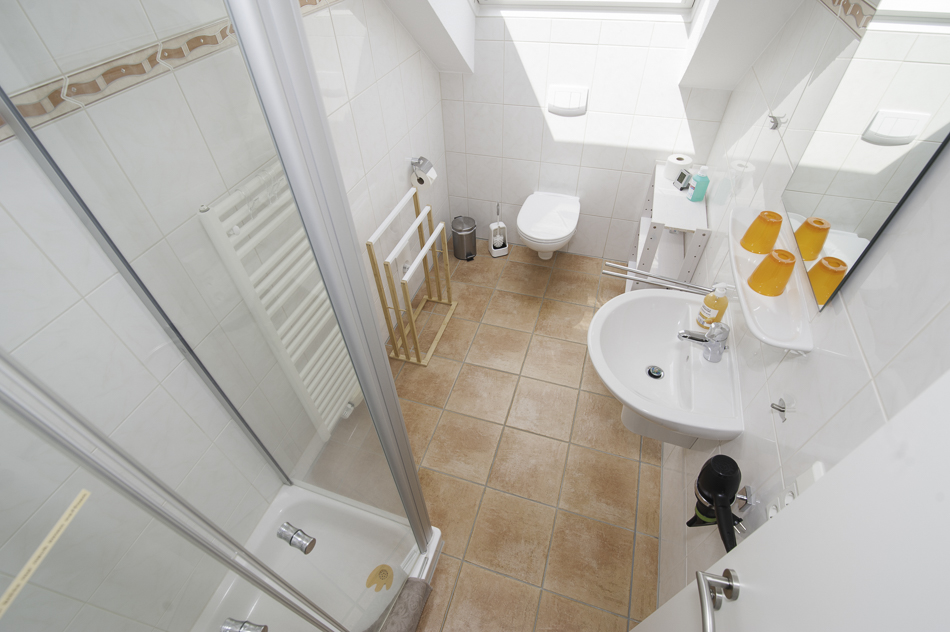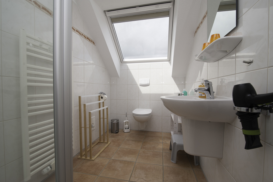 Im Obergeschoss gibt es ein weiteres Badezimmer mit Dusche, Handtuch-Heizung und Fön.