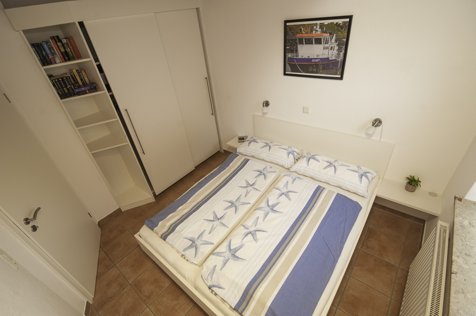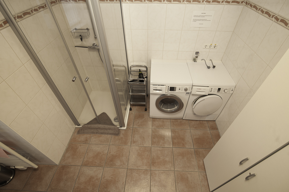 Außerdem befinden sich im Erdgeschoss ein Schlafzimmer mit Doppelbett (1,40 m breit) und Einbau-Kleiderschrank, ein Badzimmer mit großer 90x90 cm Dusche, Waschtisch, Hänge-WC, Waschmaschine und Trockner, Handtuch-Heizung sowie Fön.